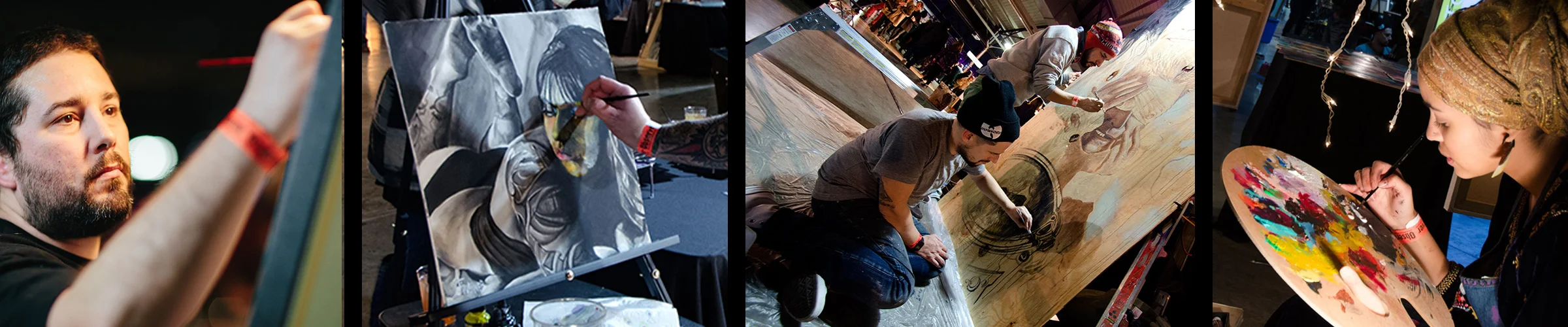 Being a part of this space will require the participating artist to be creating live (hence the name of the area). This does not mean that the artist will need to be cranking out multiple pieces, though they can if they like. It does mean that, with minimal breaks throughout the day, the artist should be working on some bit of artwork during show hours within the 3 days. In addition to being highlighted within this space, the artist will also get the opportunity (optional) to produce a piece live within the center of the overall presentation, like the Davies brothers did at Artopia (pictured above and in these photos from Artopia). We will have shifts available to artists who would like to create "center stage" throughout the weekend.