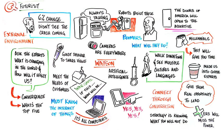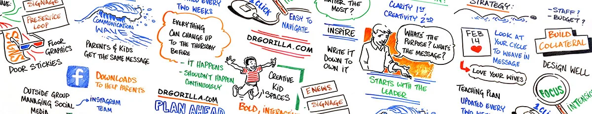 As a Scribe, David Rodriguez works with businesses and consultants to capture oral communication in visual and graphic representations. While in a meeting, David represents the ideas and developments of the meeting in a visual flow of the conversation that offers context beyond the bullet points. His scribing creates a more inclusive experience than the traditional meeting while recording the session in real time. As voices are heard, ideas are documented and a visual map is produced for collaborators. The scribing can seamlessly lead to creation of strategy maps, client campaigns, or potential video communicators for internal or external use. As either a simple facilitator and conversation guide helping with timelines, prioritization, and modeled construction or as a silent artist capturing, Rodriguez’ work takes your meetings to the next level.